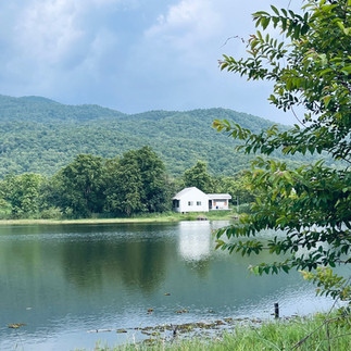 我們繞過了咖啡館直接走到湖邊,湖面波光粼粼,背景有連綿的青山,對岸有一間白色的小木屋,湖邊的大樹下坐著一對正在乘涼的情侶,這樣的形容是不是很像我們小時候畫的畫?